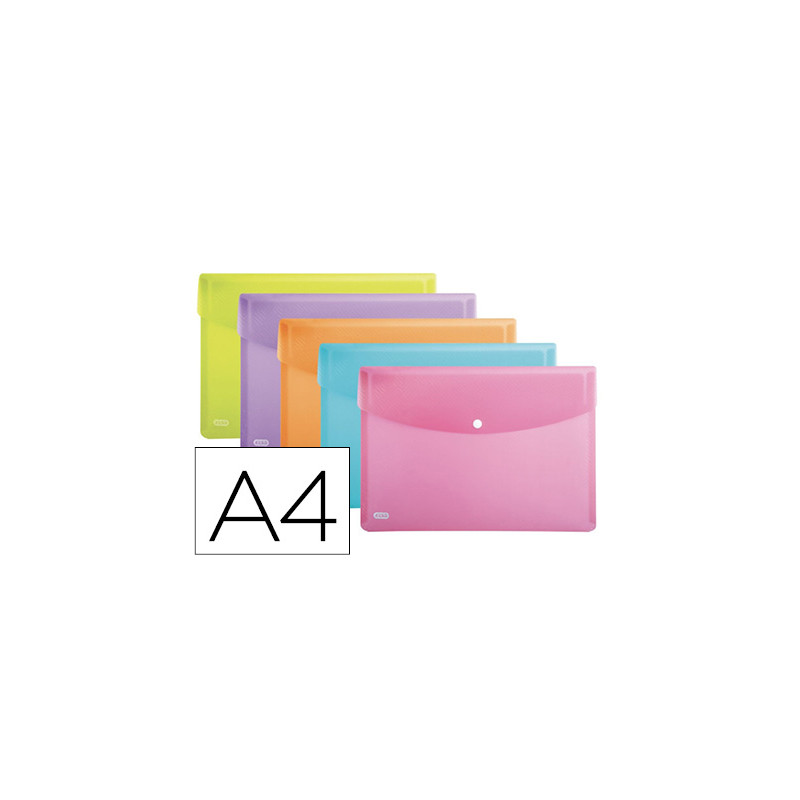 Fabricada en plßstico transl·cido rÝgido. Contenido protegido gracias a su cierre con broche. Precorte del sobre que facilita la inserci¾n de docume ntos. Tapa de plßstico rÝgido transl·cido serigrafiado de 300 micras. Pack de 5 carpetas con colores surtidos (menta, lima, naranja, rojo y turquesa ). Formato DIN A4. Capacidad para 40 hojas.