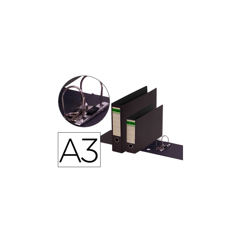 Archivador de cart¾n compacto, extraduro y resistente. Etiqueta en el lomo . Mecanismo de palanca. Con Rado«. Ancho del lomo 80 mm. 2 anillas. Color negro liso. Formato DIN A3 apaisado. Medidas: 480 x 320 mm.