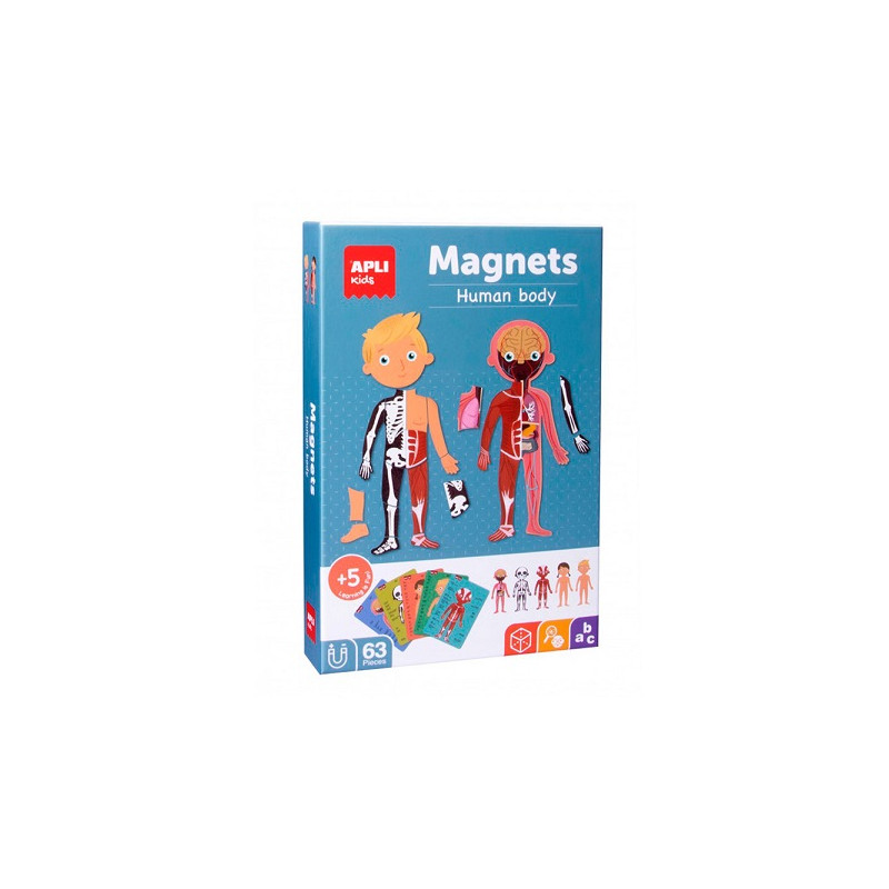 Juego magnÚtico modelo El cuerpo humano para ayudar a los ni±os a familiar izarse con las distintas partes del cuerpo humano. Cada juego contiene: 1 escenario imantado de 28 x 18 cm y 63 fichas magnÚticas con las diferentes partes del cuerpo humano, el esqueleto, los ¾rganos y los m·sculos. Inclu ye 15 fichas con informaci¾n detallada en 12 idiomas distintos. Juego con un alto valor didßctico: fomenta la observaci¾n y la imaginaci¾n, aumenta la concentraci¾n y la atenci¾n, y genera interÚs en objetos y hßbitos que desconocen. Recomendado para ni±os a partir de 5 a±os.
